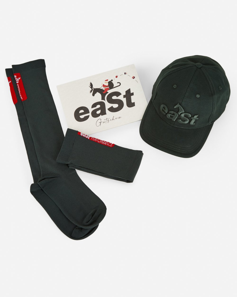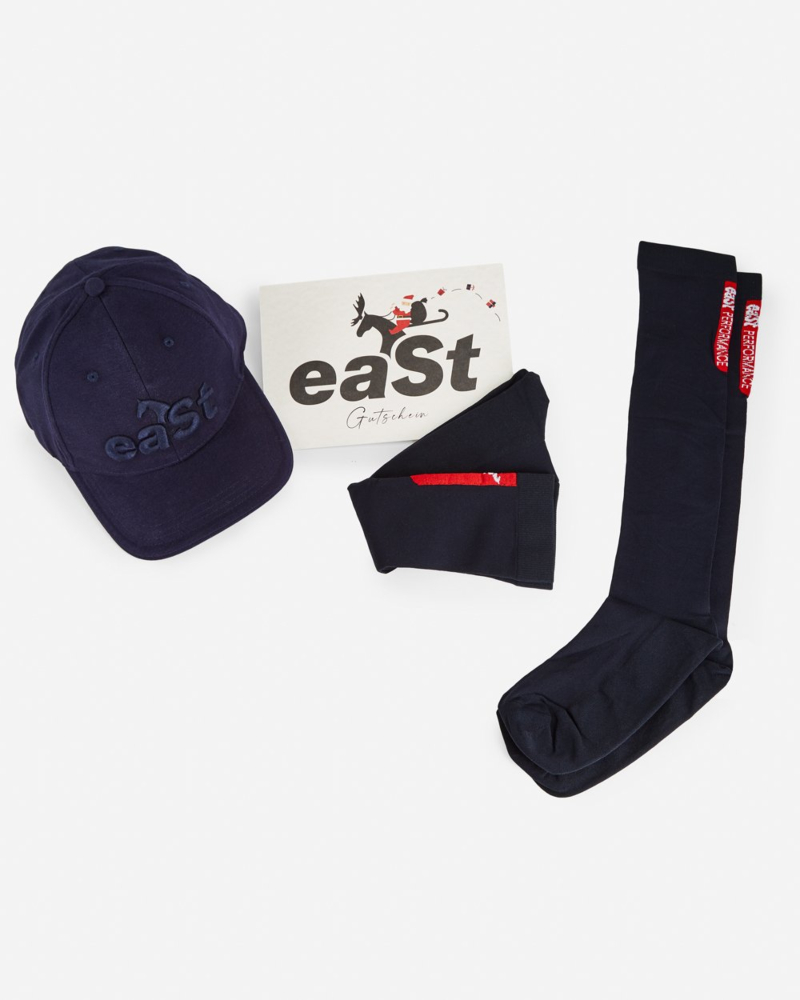 Kaufe einen Gutschein im Wert von 150 € und erhalte unsere eaSt Cap sowie eaSt Socks gratis als Geschenk dazu. Das sportlich-funktionale eaSt Cap schützt dich im Sommer vor der Sonnenstrahlung und verleiht dir beim Reiten und in der Freizeit eine lässige Figur. Die eaSt Riding Socks schmiegen sich federleicht an deine Füße und erleichtern das Anziehen der Reitstiefel.